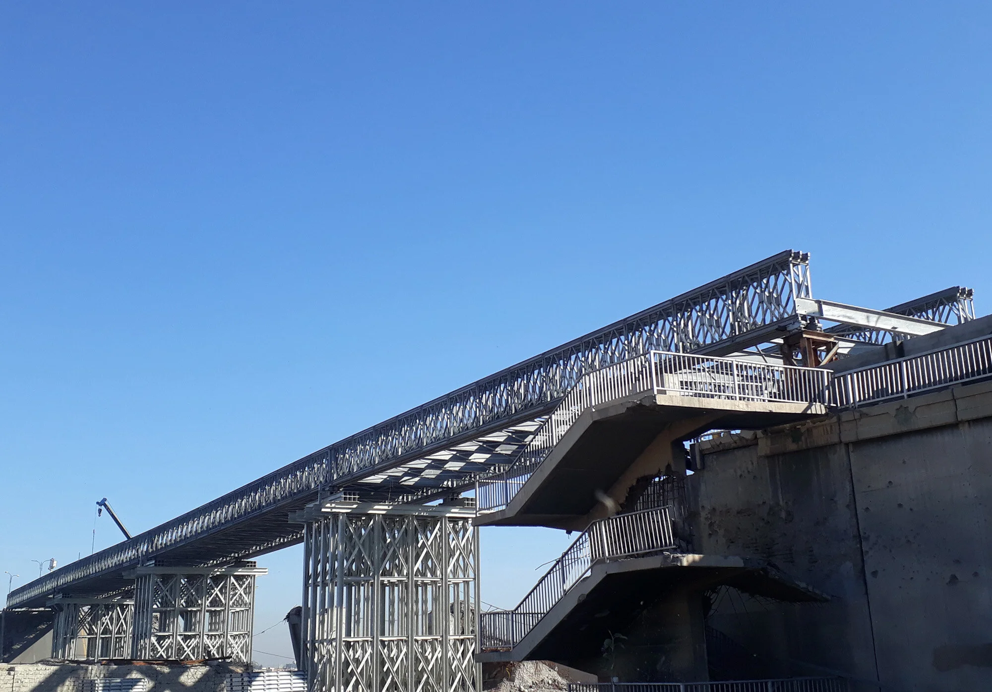 Four spans were pre-assembled on the cantilevered and intact span of the concrete bridge and then launched across the gap towards the opposite shore. Some piers had to be replaced with temporary steel structures. After launching, the span closest to the shore was jacked down on one side to compensate for the height difference of 3.6m between the old abutment and the remaining parts of the concrete bridge. Three spans were connected by span junction components, allowing for a small amount of movement as individual spans are loaded. The overall length of the panel bridge is 172m, divided into four spans of around 43m each.